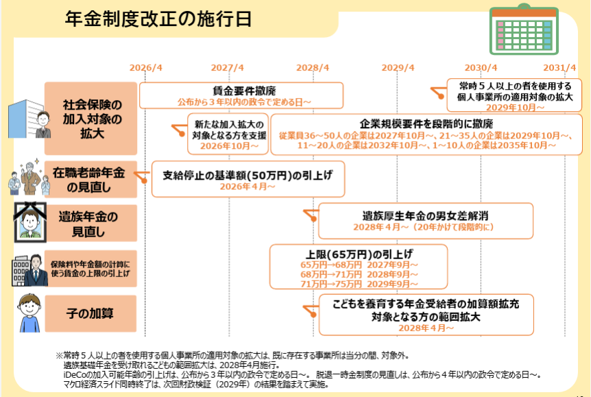 この改正は、少子高齢化・働き方の多様化が進む中、年金制度の機能を強化し、すべての人にとって持続可能で公平な年金制度を目指すものです。