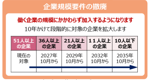 これまで「従業員51人以上」の企業に限定されていた社会保険の適用も、2027年10月以降段階的に撤廃され、最終的にはすべての企業で対象者が適用となります。