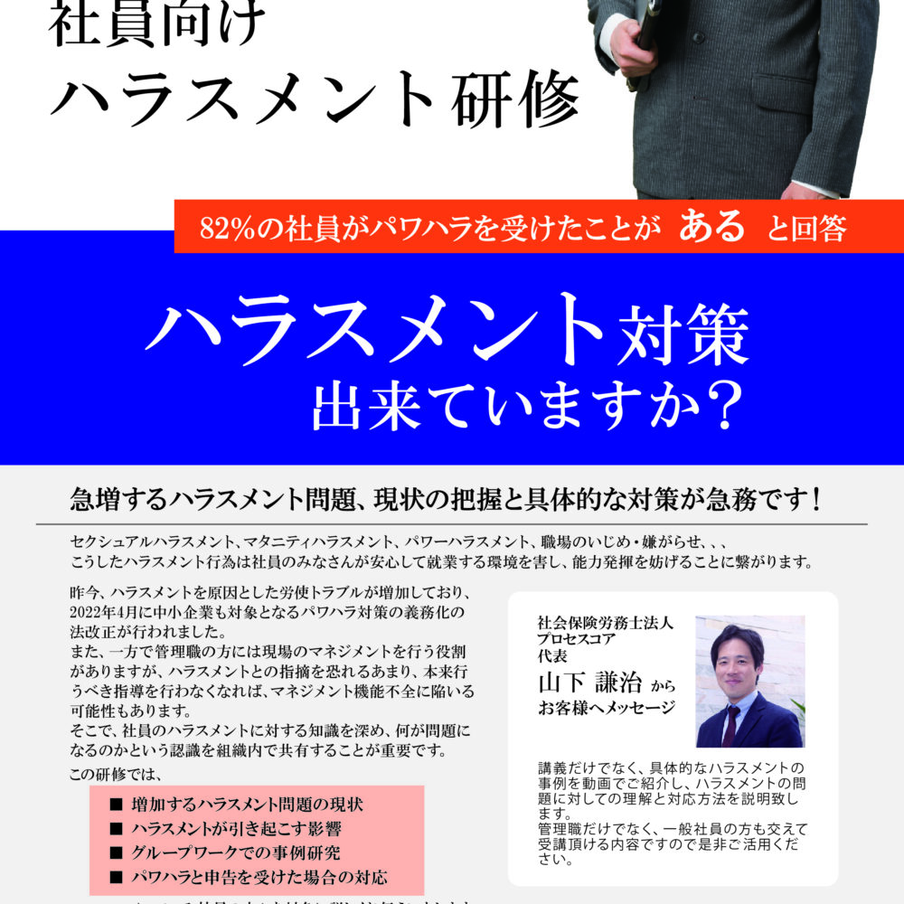 中小企業様対象「社員向けハラスメント対策研修」 急増するハラスメント問題、現状の把握と具体的な対策が急務です! セクシュアルハラスメント…